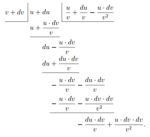 Розглянемо такий приклад: \(y = \dfrac{bx^5 + c}{x^2 + a}\). У цьому випадку марно намагатися опрацювати ділення заздалегідь, тому що \(x^2 + a\) не ділиться на \(bx^5 + c\), і вони не мають спільного множника. Тож не залишається нічого іншого, як повернутися до початкових принципів і винайти правило. Тому ми візьмемо \[y = \frac{u}{v};\] де \(u\) і \(v\) дві різні функції незалежної змінної \(x\). Тоді, коли \(x\) стане \(x + dx\), \(y\) стане \(y + dy\); і \(u\) стане \(u + du\), а \(v\) стане \(v + dv\). Тоді \[ y + dy = \dfrac{u + du}{v + dv}. \]